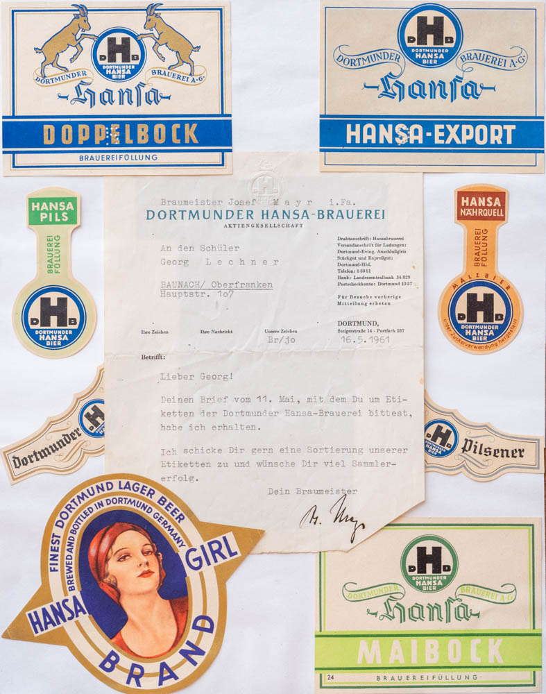 Bereits mit 5 1/2 Jahren begann ich in der elterlichen LECHNER-BRÄU, Baunach, mit dem Sammeln von Bierflaschenetiketten. Anfangs wurden die Flaschen im zurückkommenden Leergut gesammelt und dann in der Badewanne abgeweicht. Ab 1961 wurden dann verschiedene Brauereien auch angeschrieben. Hiervon ist noch ein Brief der Dortmunder Hansa Brauerei vorhanden.